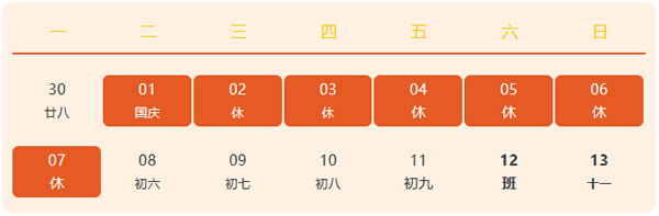 放假時間:10月1號至10月7號,共計7天,9月29號(星期天),10月12號(星期六)正常上班。